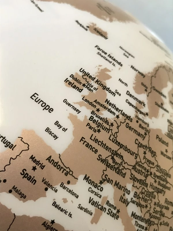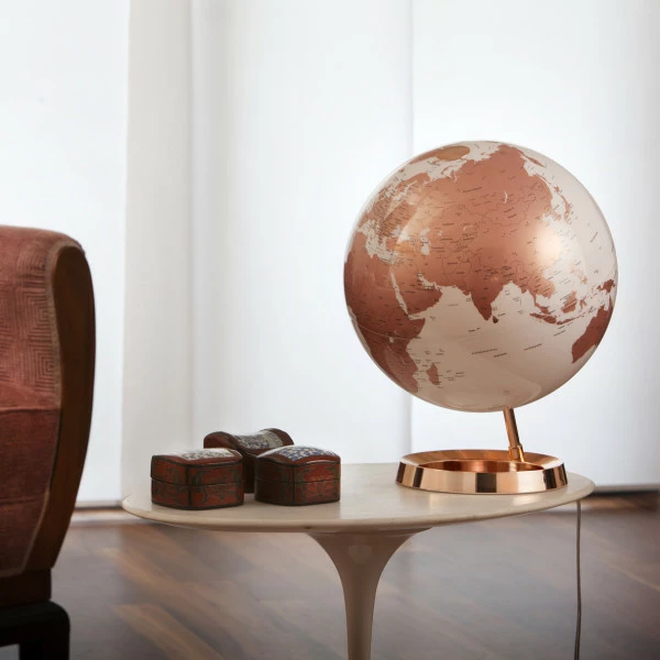 Elegant globus i et skinnende look med rene, hvite farger, tilsatt kobber elementer. Helt unik effekt som virkelig kommer til syne, når lyset blir tent i globusen. Her vil globusen vise frem kontinentene i flere farger, som gjør at de fremtrer endna mer tydelig. Globusen kan selvfølgelig vende om seg selv. Du har derfor god mulighet for å nå jorden rundt på et split sekund.