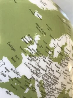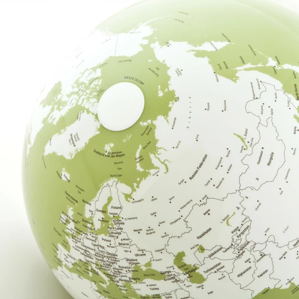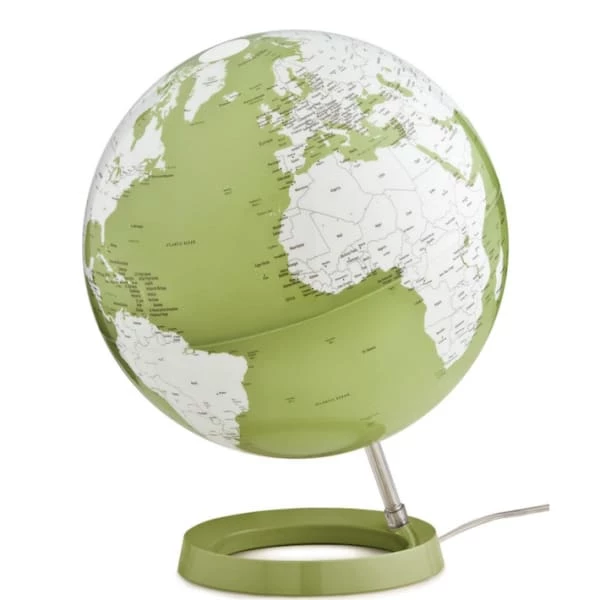 Elegant globus i et shiny look, med rene, hvite farger tilsatt pistasiegrønne elementer. Helt unik effekt, som virkelig kommer godt til syne når det tennes for lyset i globusen. Da vil globusen vise frem kontinentene i flere farger og hvor de vil stå frem endna mer tydelig. Globusen kan selvfølgelig snurres. Du har derfor god mulighet for å nå jorden rundt på et split sekund.
