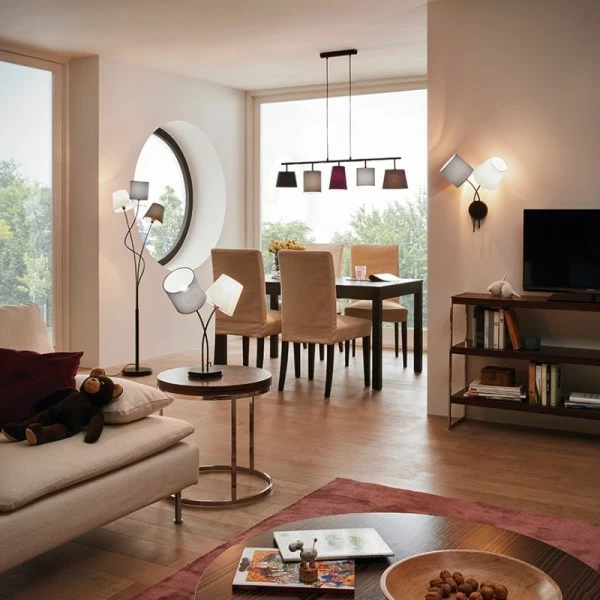Flott bordlampe fra Eglo. Lampen har 2 stoffskjermer og et stativ i svartlakkert stål. Lampen er forsynet med bryter på ledningen.