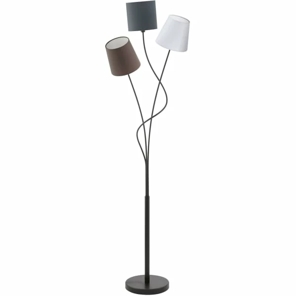 Flott gulvlampe fra Eglo. Lampen har 3 stoffskjermer og et stativ i svartlakkert stål. Lampen er forsynet med en fotbryter.
