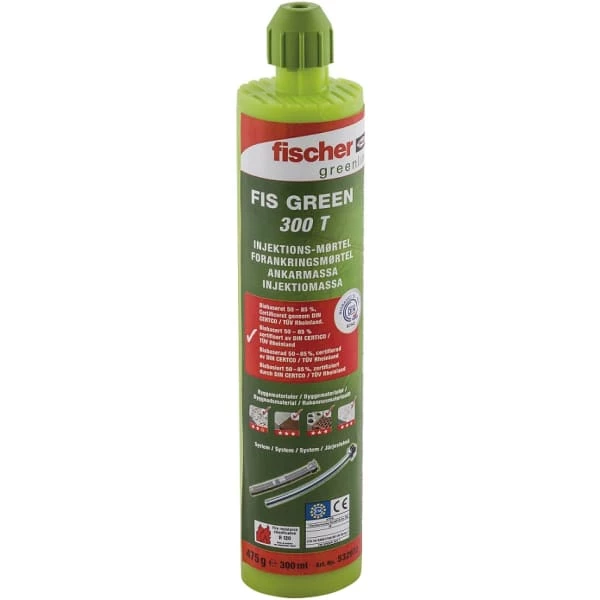 Dette er den første Injeksjonsmørtel produsert av resirkulertet resurser. Laget av 50-85/ biobaseret materialer. Den grønne utgaven er en mer miljøvennlig utgave av den klassiske grå serie fra Fischer. Det er ikke gått på kompromiss med verken kvalitet eller bæreevne.