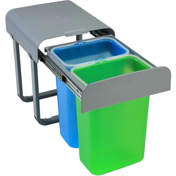 Avfallssorteringsystem i kraftig plast med glideskinne i metall for montering i bunnen av kjøkkenskapet. Mindre utgave av Ekko modellen.