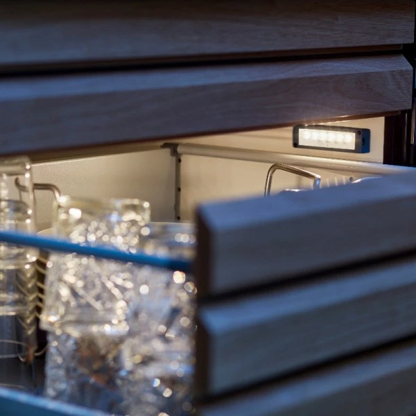 Skuffelys til montering i høyre side av skuffe med sensor som sørger for at lyset tenner når skuffen åpnes. Hvis du vil være sikker på at lyset når hele skufen, anbefaler vi at du bestiller en pakke med både høyre og venstre side.