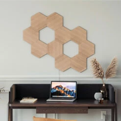 Disse flotte, hexagon-formete treelementer er med til å gi et elegant og organisk uttryk i hjemmet ditt. Heng dem på veggen bak sofaen for å gi din stue et nordisk uttryk i beste stil. Det er et hav av muligheter for hvordan du kan ønske at de skal henge på veggen. Kun fantasien setter grenser.