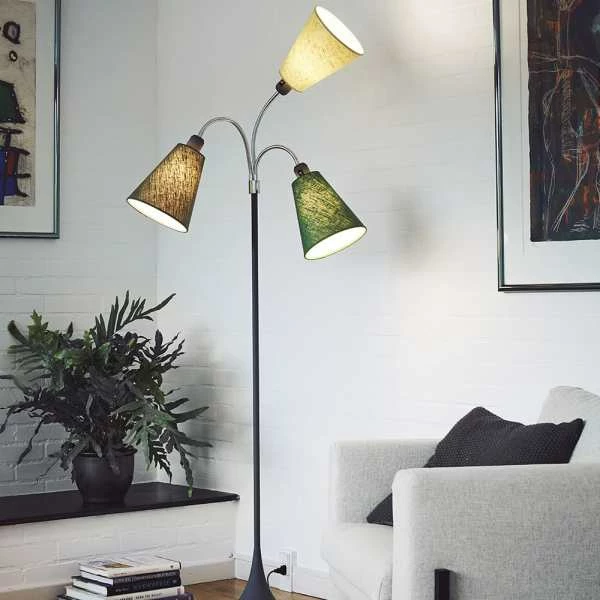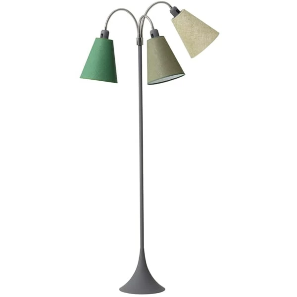 Klassisk gulvlampe med tre flexible armer, det er brytere på armene. Lampen leveres utan lampeskjermar, slik at du selv kan velge hvordan din lampe skal se ut, tre likr skjermer eller flere ulike farger – du bestemmer! Carolin lampeskjermene passar til Trafik gulvlampen.