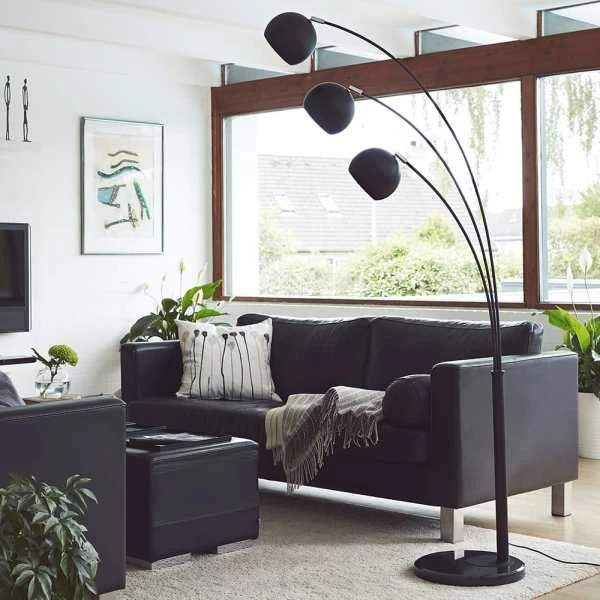 Høy gulvlampe med tre lampeskjermer i metall. Nice leveres med 3 meter ledning og bryter på ledningen. Lampen har E14 fatninger og leveres uten lyskilder.