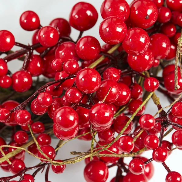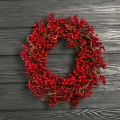 Flott og naturtro grankrans i plastik med røde bær. Julekransen er perfekt som dekorasjon på julebordet til julefesten, juleaften eller som dekorasjon på kommoden eller hengende på hoveddøren.