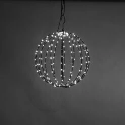 Flott metalkule til pynt i vinduet eller hjørnet i stuen. Den er IP44 sikret. Det betyr, at den også kan henge utendørs. Kulen lyser med hele 192 små LED dioder og er i størrelsen Ø30 cm. Julekulen får sin strøm via. 230V. Kulen lyser opp som en fin ildkule.