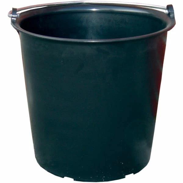 Høyt sort spann i kraftig materiale med et kraftig metallhåndtak og innvendige mål.