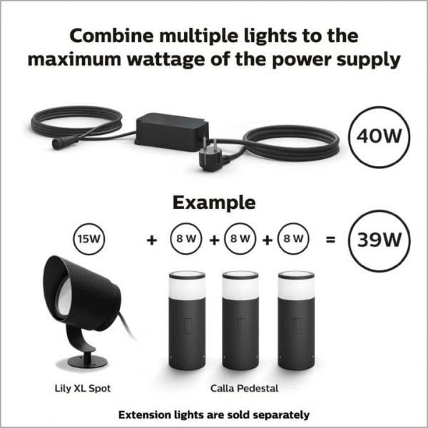 Denne strømforsyning passer til alle Hue lavvolt udendørslamper – Herunder lamperne Impress, Lily og Calla lavvolts lamper, men også udendørs lightstrip. Strømforsyningen er til dig som enten vil have flere Hue lavvolt lamper til ét stik end den medfølgende transformer kan klare, eller hvis du har en overskydende Hue lavvolt lampe som du vil have en strømforsyning til.