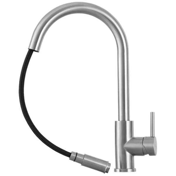 Kjøkkenbatteri i tidløs design. Med høy tut og uttrekkbart munnstykke er det lett å skylle vasken eller rengjøre kjøkkenbenken.