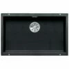 Hvid kjøkkenvask i granitek med kurvventil i kummen og praktisk bredt bakpanel.