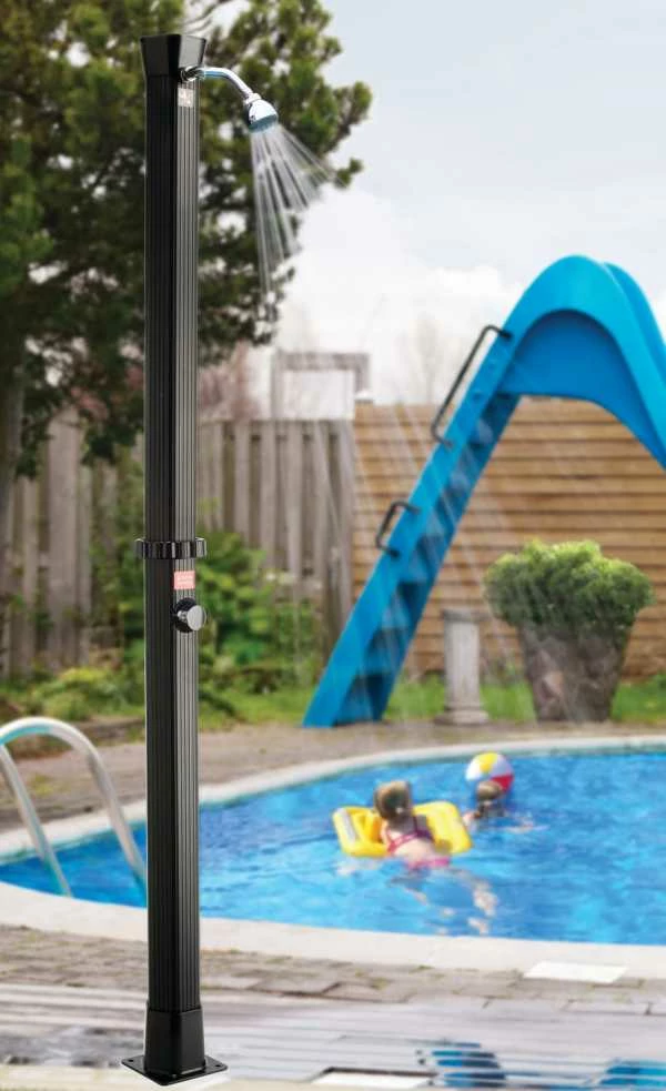 Milano utedusjen fra Swim & Fun er utstyrt med stor varmtvannsbeholder, som kan romme 20 liter vann. Vannet oppvarmes utelukkende av solenergi, og det vil derfor være varmt vann hele dagen, ettersom vannet løpende fornyes og varmes opp i dusjrøret. Selve vanntilførselen er enkel å installere, da hele systemet kun tilsluttes hageslangen med medfølgende slangekobling.