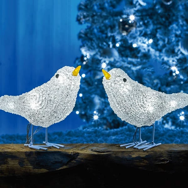 Dekorativ Akryl hvite fugler med 5×8 hvite LED lys for hyggelig belysning. Størrelse 15x7x12,5 cm. 5 meter ledning 30 cm mellom hver fugl. IP44 transformer godkjent til innendørs og utendørs bruk.