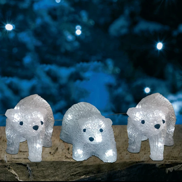 Dekorativ Akryl Isbjørne med LED lys, for hyggelig belysning. Størrelse 15 til 18 cm. 3 meter ledning 30 cm mellom hver isbjørn. IP 44 transformer godkjent til innendørs og utendørs bruk.