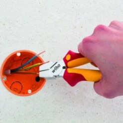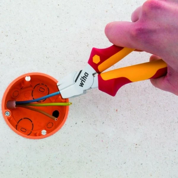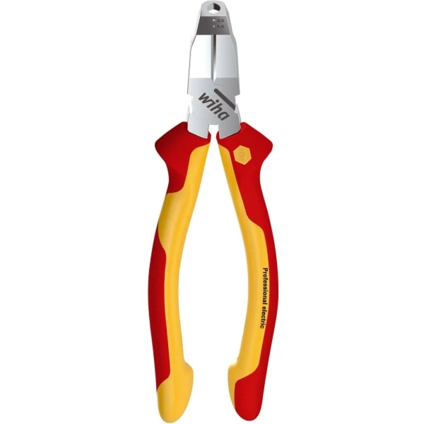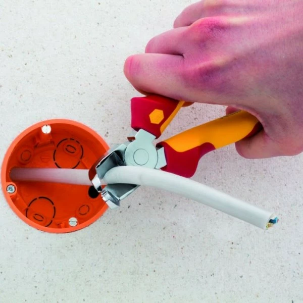 3-i-1 tang til avklipping av kabler og avisolering. Tangen er perfekt til arbeide på vanskelig tilgjengelige områder, f.eks. i samlebokser og fordelerbokser, da det vinklede hodet gjør det muligt å avisolere helt i bunnen av boksen. Tricut er godkjent til å arbeide på eller omkring elektriske komponenter opp til 1000 V AC.